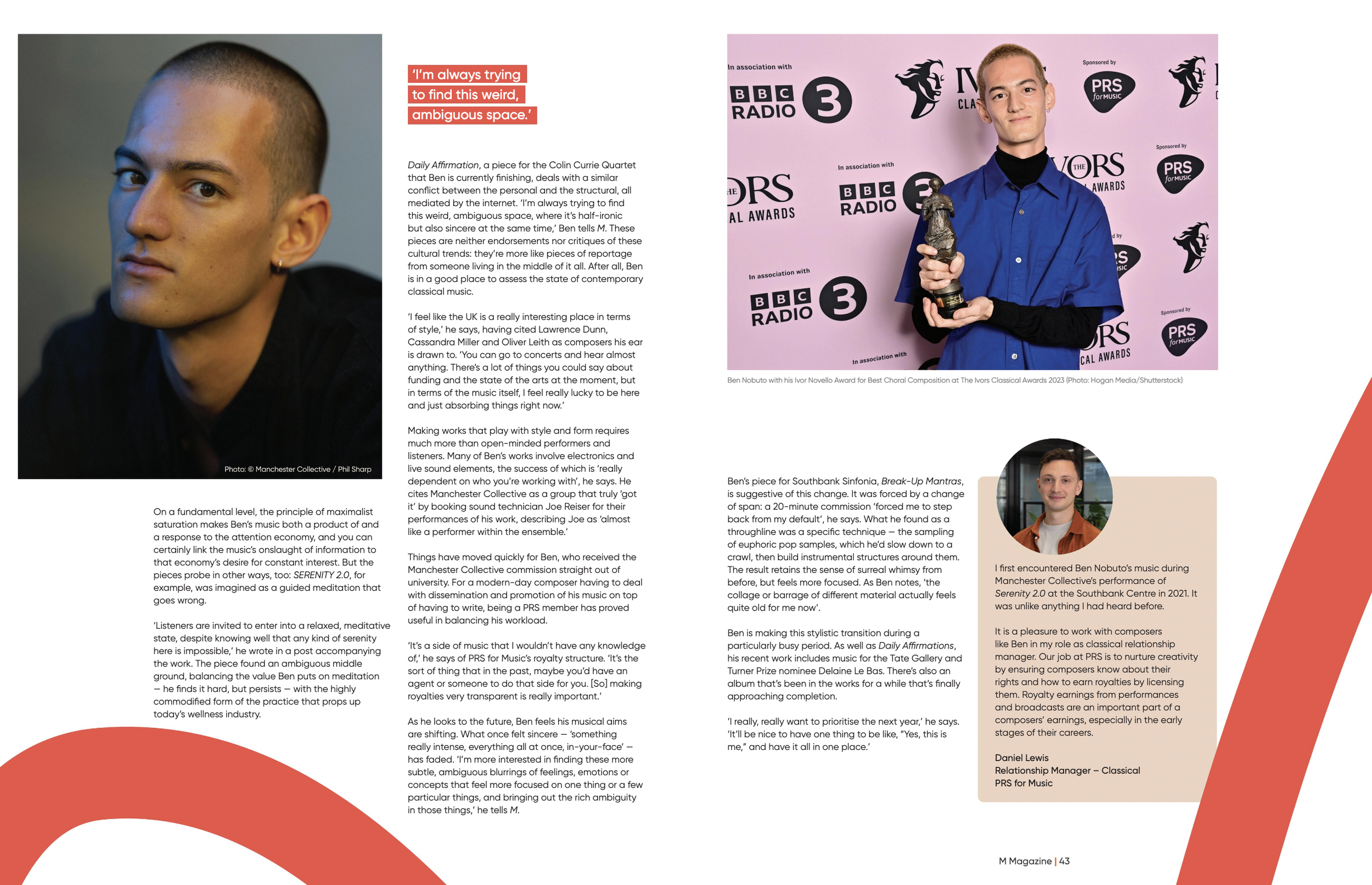 Daily Affirmation, a piece for the Colin Currie Quartet that Ben is currently finishing, deals with a similar conflict between the personal and the structural, all mediated by the internet. ‘I'm always trying to find this weird, ambiguous space, where its half-IronIc but also sincere at the same time,’ Ben tells M. These pieces are neither endorsements nor critiques of these cultural trends: they're more like pieces of reportage from someone living in the middle of it all.